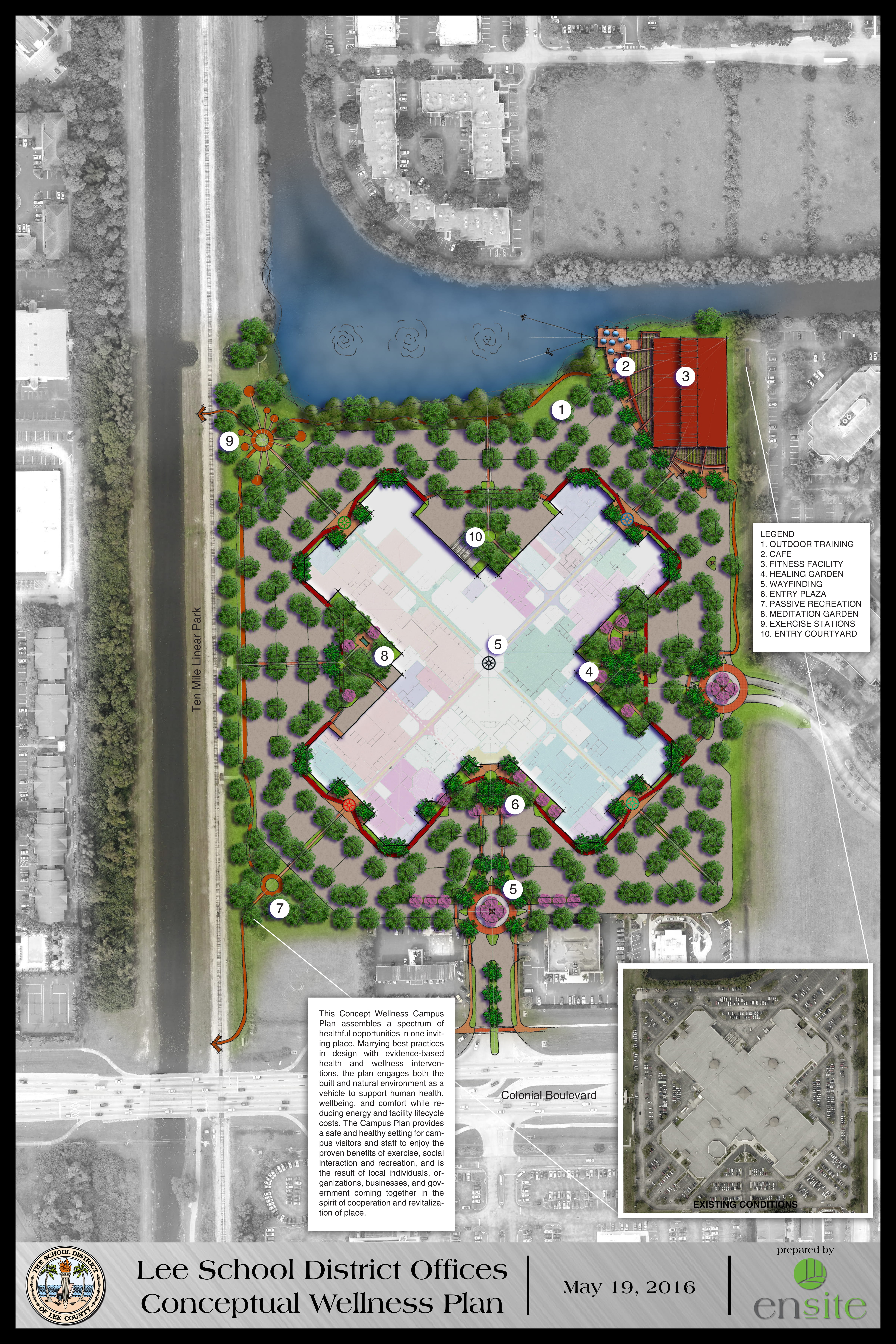 Marrying best practices in design with evidence-based health and wellness interventions, this concept wellness plan for the offices of the School District of Lee County engages both the built and natural environment as a vehicle to support human health, wellbeing, and comfort while reducing energy and facility lifecycle costs. The plan provides a safe and healthy setting for campus visitors and staff to enjoy the benefits of exercise, social interaction and recreation, and is the result of local individuals, organizations, businesses and government coming together in the spirit of cooperation and revitalization of place.